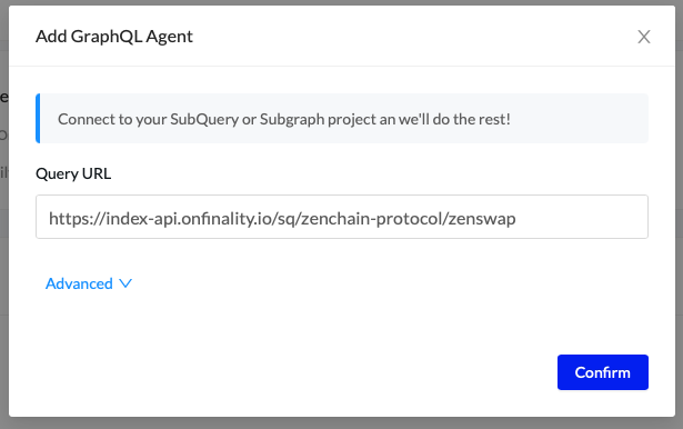 Enter your Subgraph Query URL. If your SubQuery or Subgraph is hosted externally (not with OnFinality) you may need to enter an authorisation token under Advanced