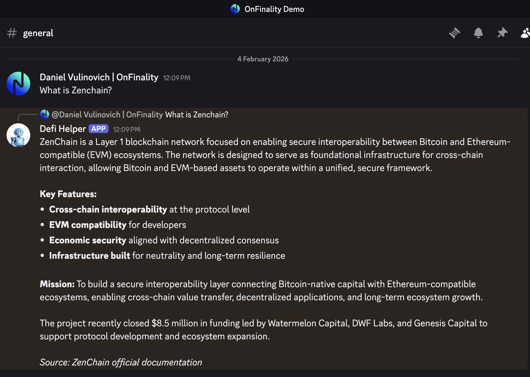 In this guide we’ll help you to set up an example AI Agent, providing responses to Discord based on the project’s: