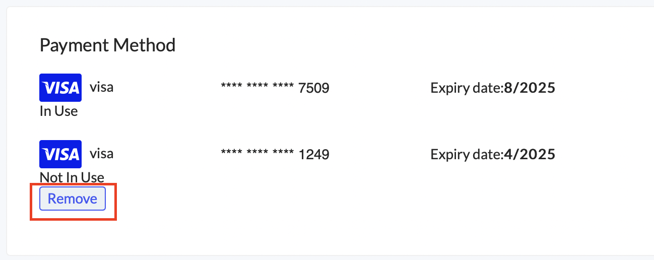 In-use credit cards cannot be removed. First change the payment method to a new card