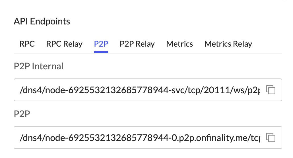 The P2P Internal address can only be reached by other OnFinality-hosted nodes in the same region. When wanting to connect two nodes nodes hosted in the same OnFinality region, it is strongly suggested to use the P2P Internal address for superior performance.