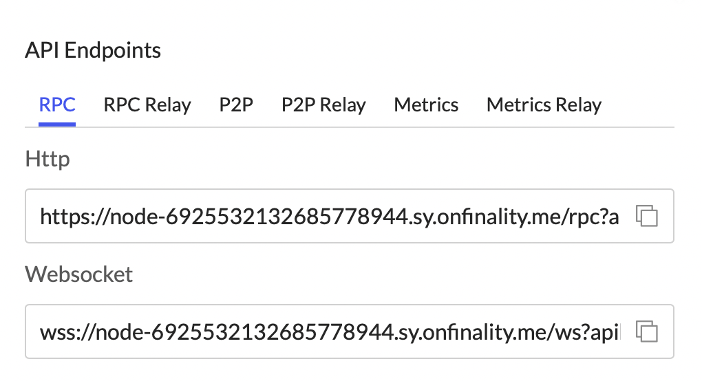 OnFinality offers the following endpoints to connect to your dedicated node: