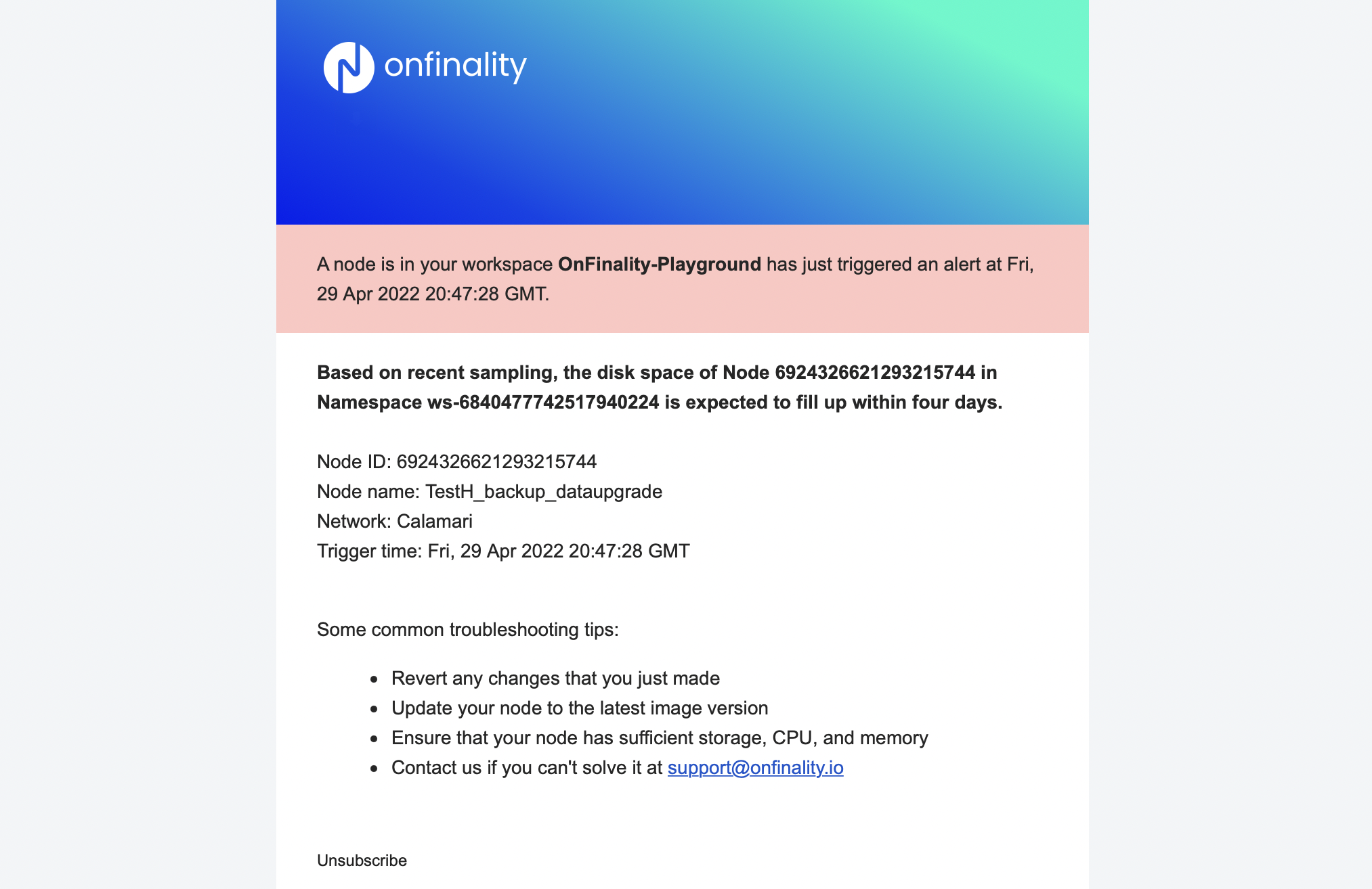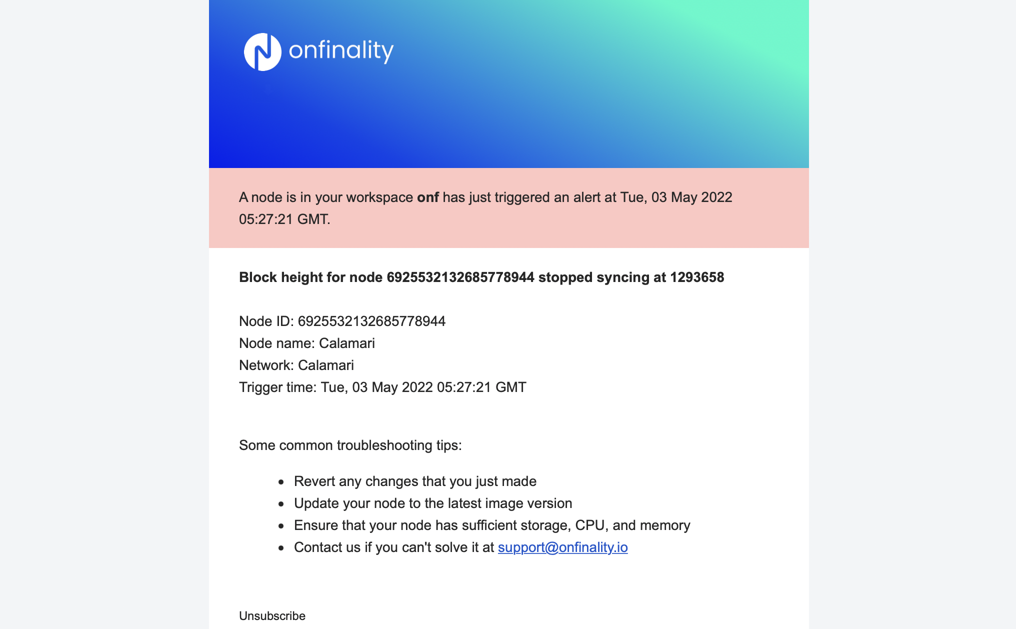 This alert is triggered when the node’s block height doesn’t increase in over 5 minutes. Alongside the troubleshooting tips in the email you can also check the OnFinality Status Page to see if there is a network-wide outage.