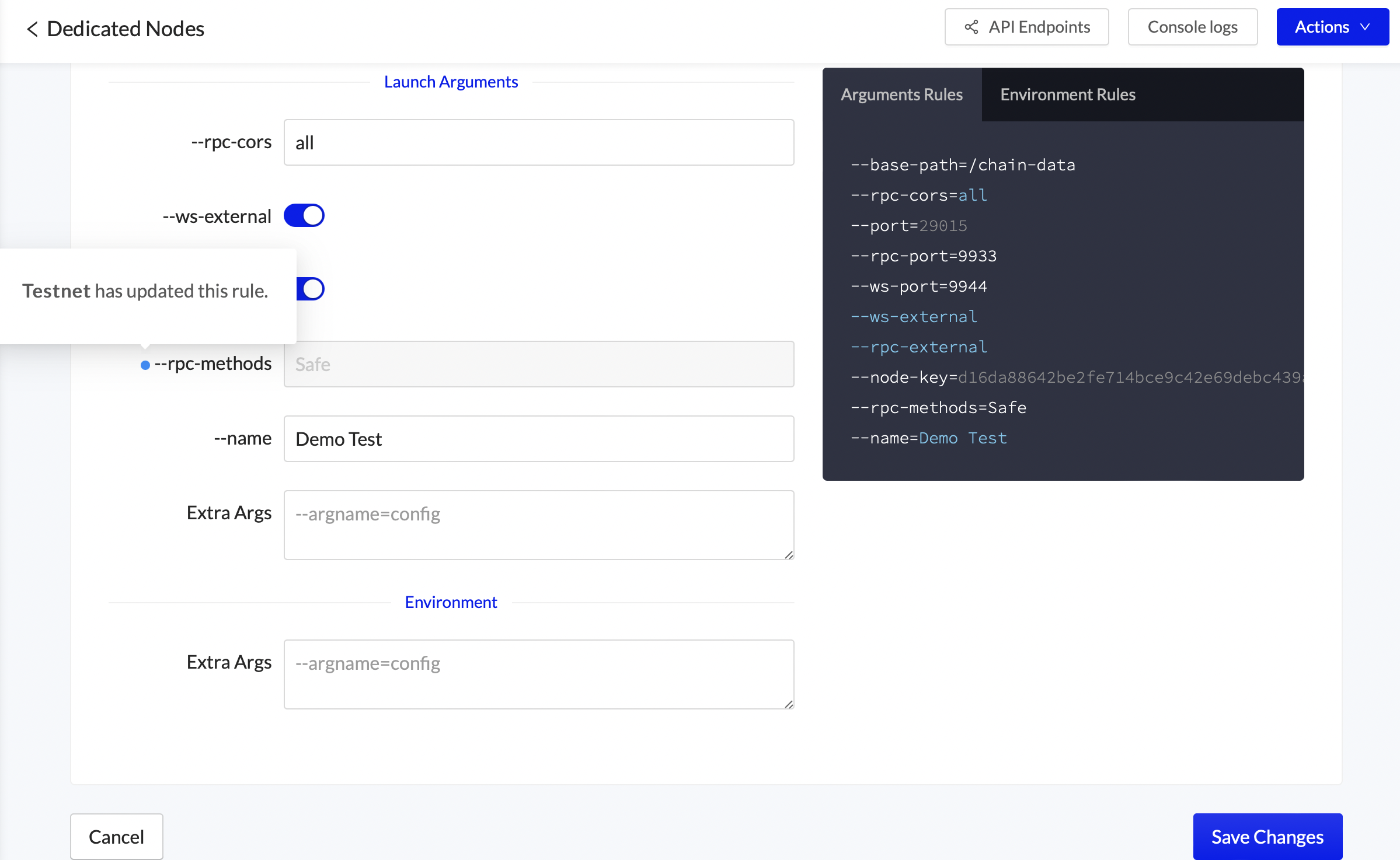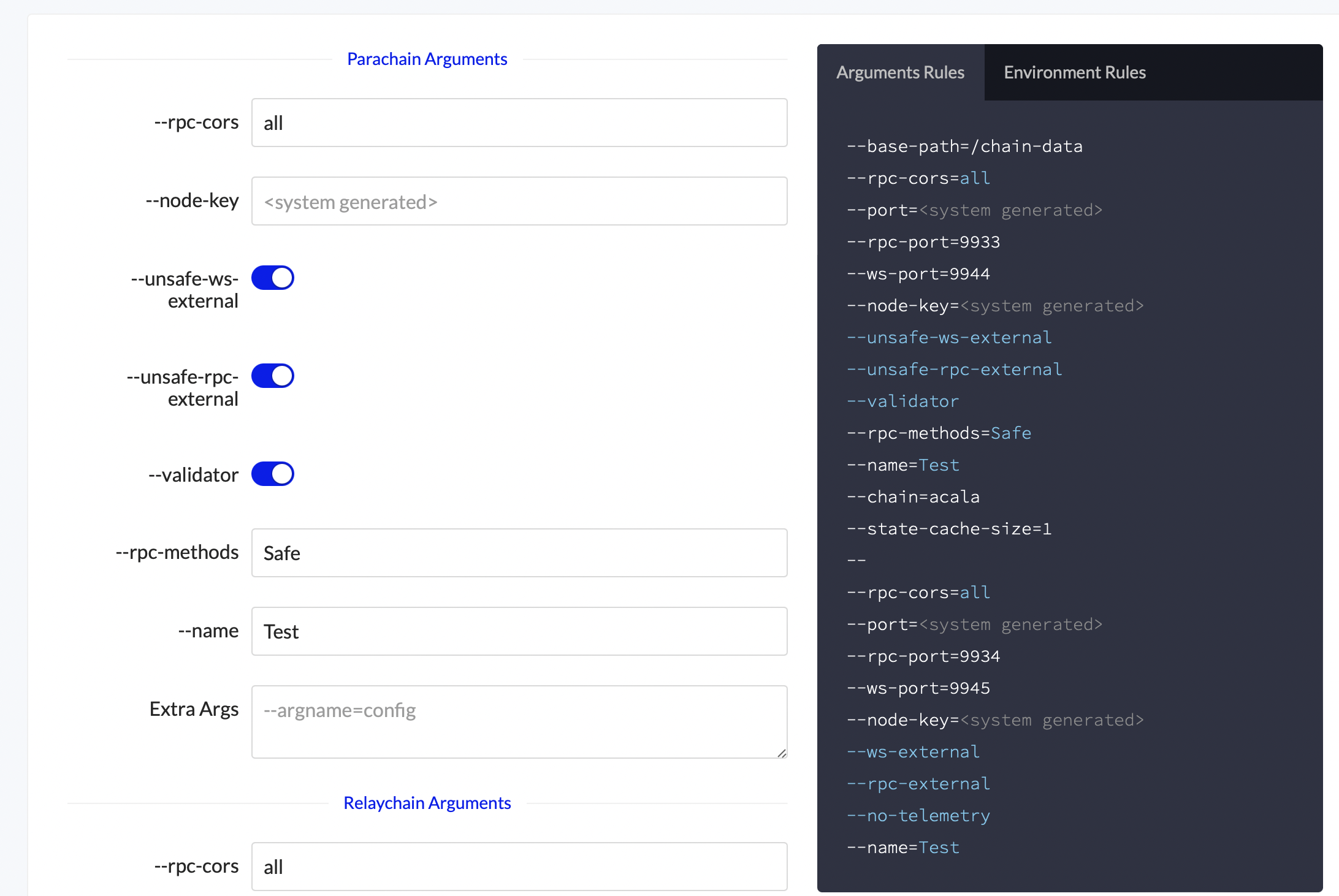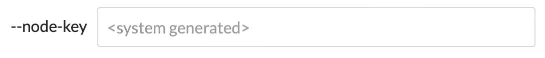 System Generated | System Generated Arguments will display in grey in the preview pane. ![]() A system generated argument while deploying a dedicated node ![]() The same argument after the node has been deployed Some system generated arguments, such as node key, can be optionally overridden when deploying the node. They cannot be updated once created. ![]() |