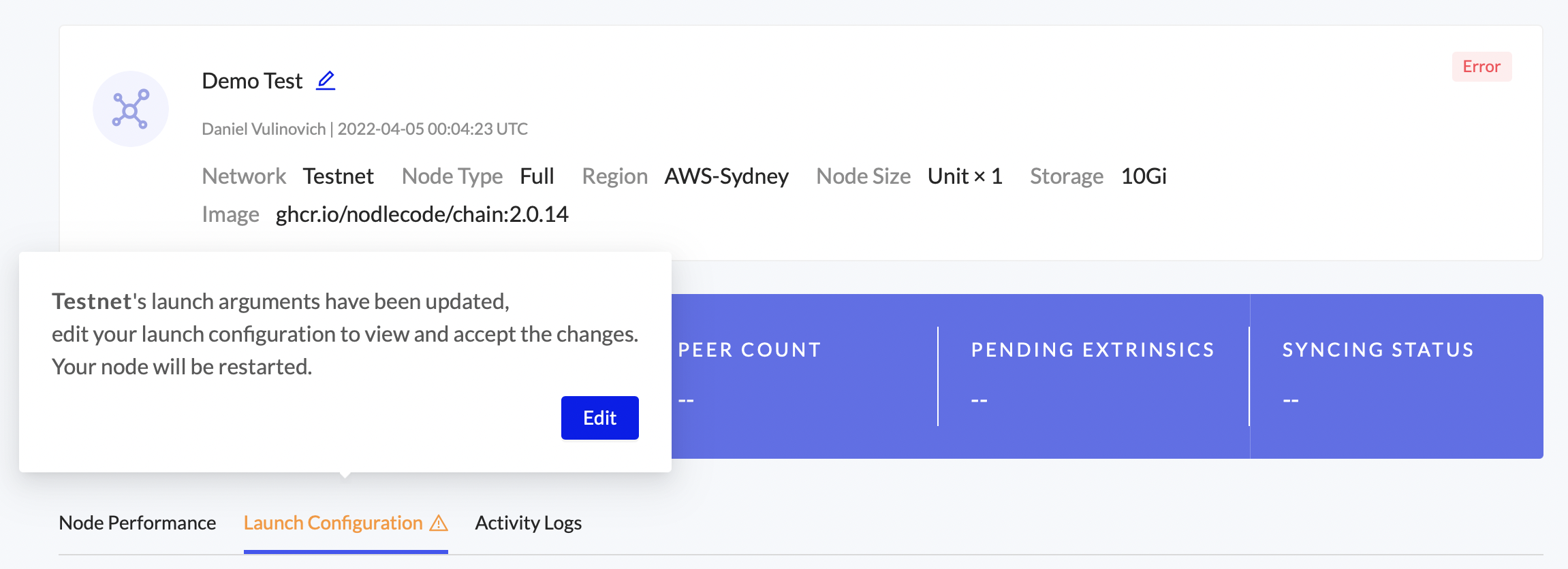 If the network’s launch arguments have been updated the following alert will be shown on the Launch Configuration tab