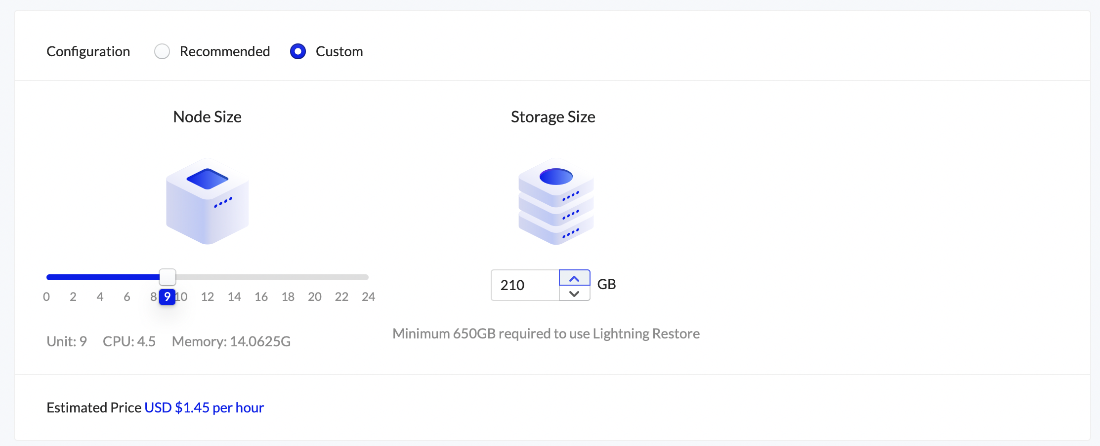 To change the configuration select “Custom” and select the required Node Size and Storage Size.
