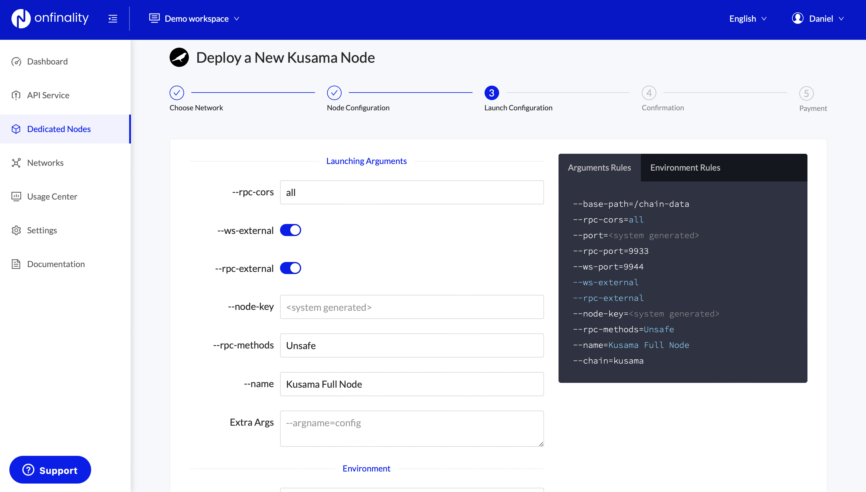 Here, you can make any necessary changes to the node’s launch arguments and environment rules. The default arguments are enough for standard use, refer to the Network’s documentation for details about each argument.