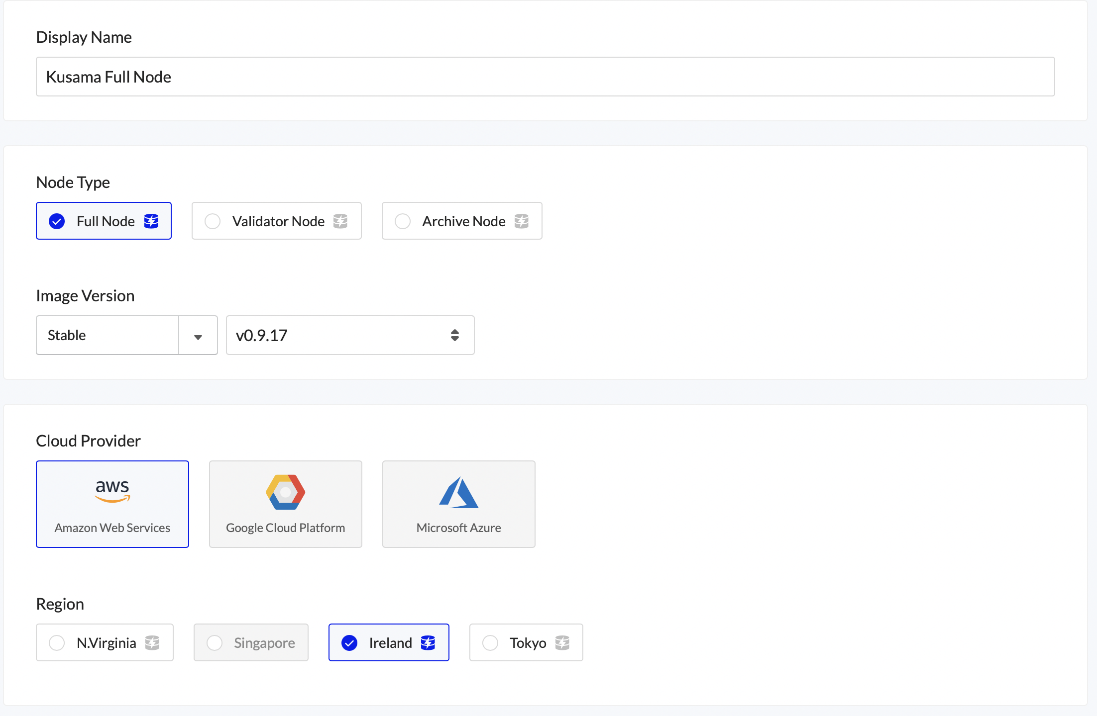 This step allows you to enter the various settings that you want your node to be created with. You can enter a memorable name and select the node type, image version, cloud provider, and deployment location. We always recommend using the latest stable image version.