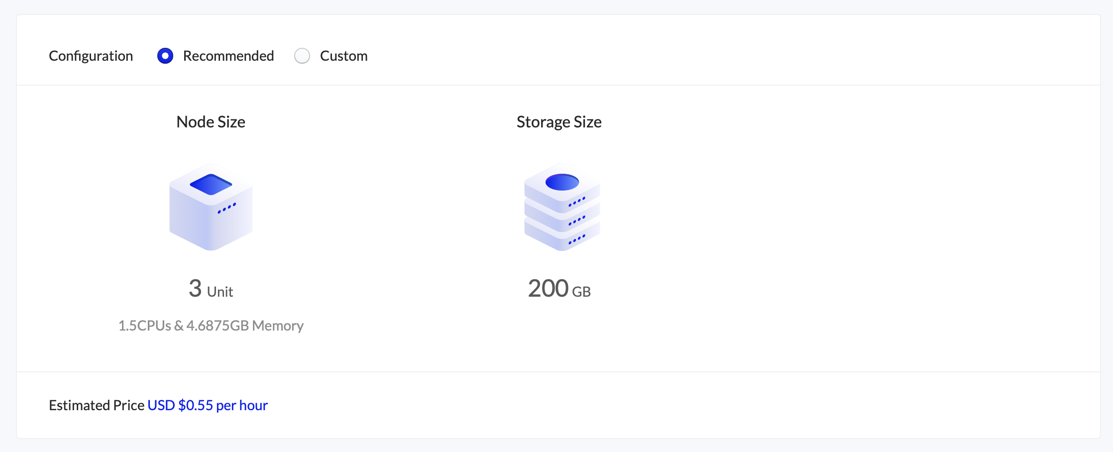 The Estimated Price of running this node for an hour will be updated as you change the Node Size or Storage Size