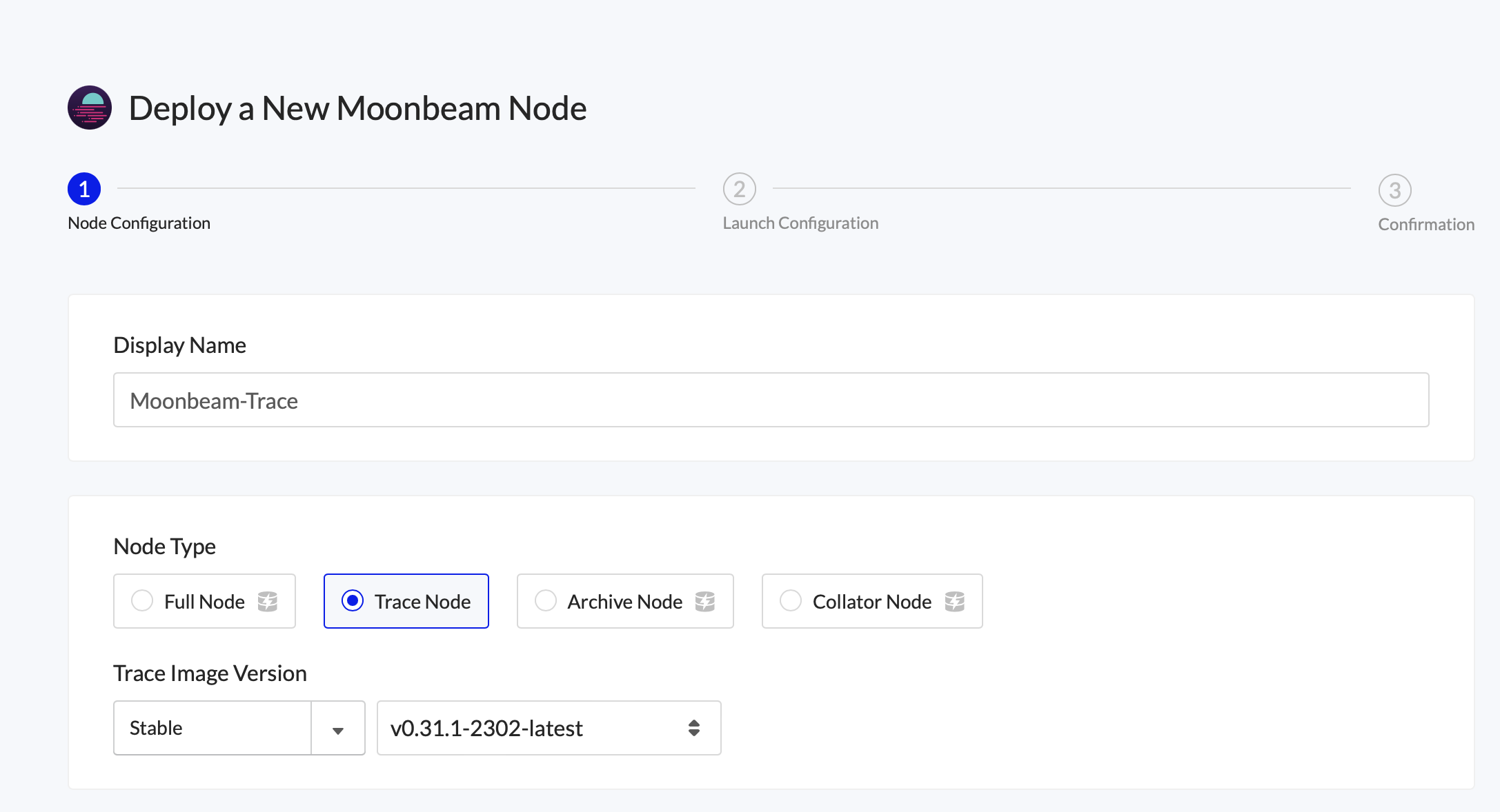 Next, review the node’s Launch Configuration. The recommended settings are usually sufficient and have all relevant arguments for trace enabled, but we recommend comparing with Moonbeam's official guide to be certain.
