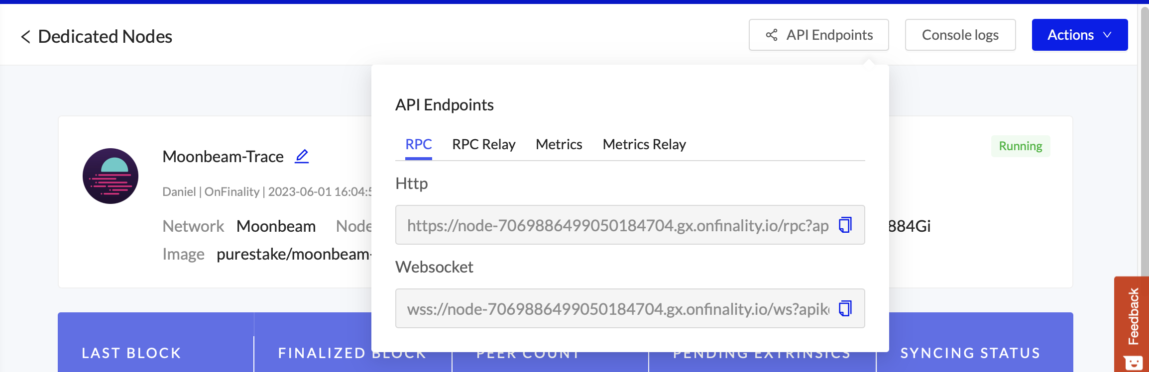 Once the status has changed to Running, you will find the RPC endpoint by clicking on the node and opening the API Endpoints window