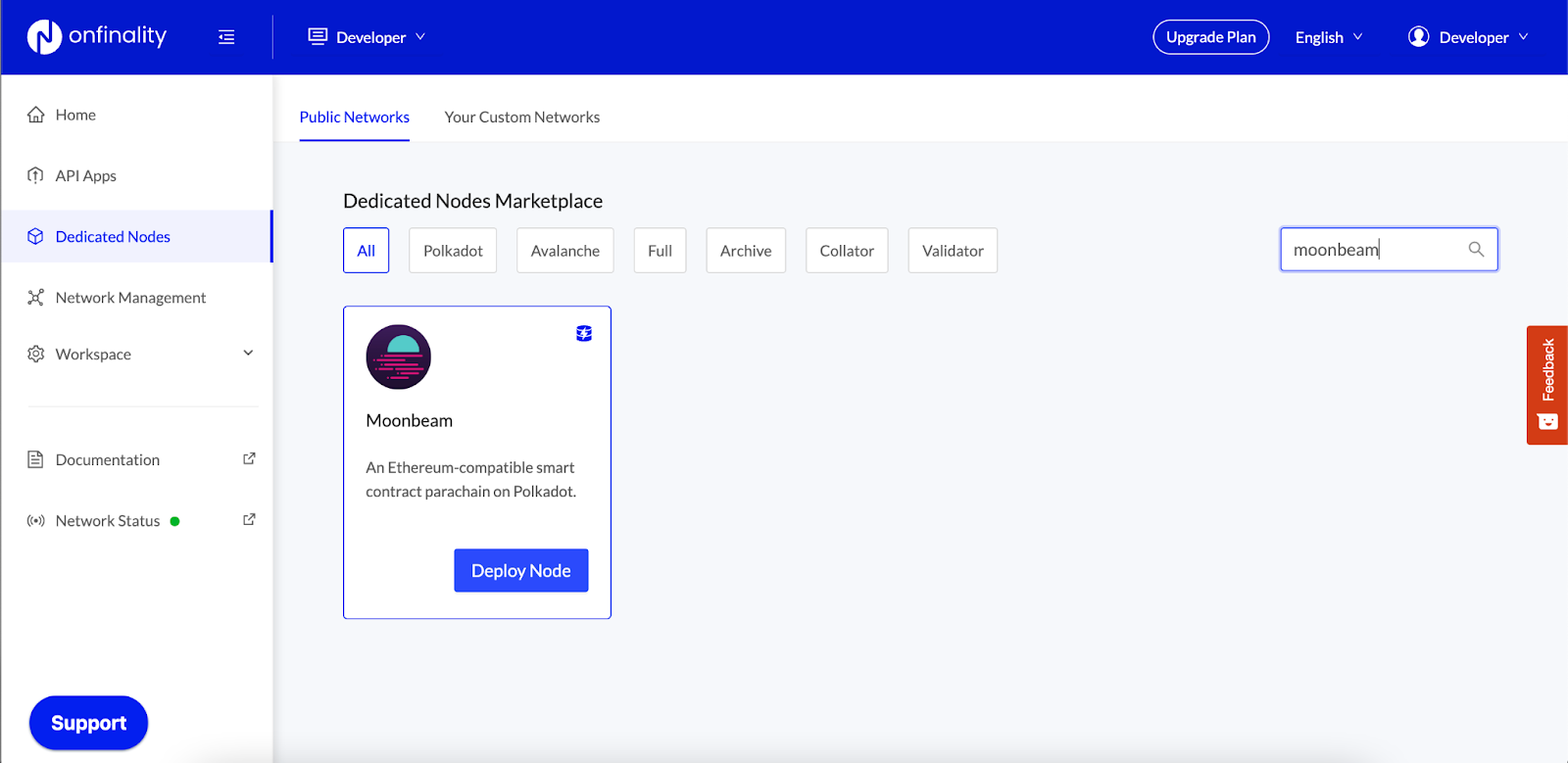 Search for Moonbeam and then click Deploy Node