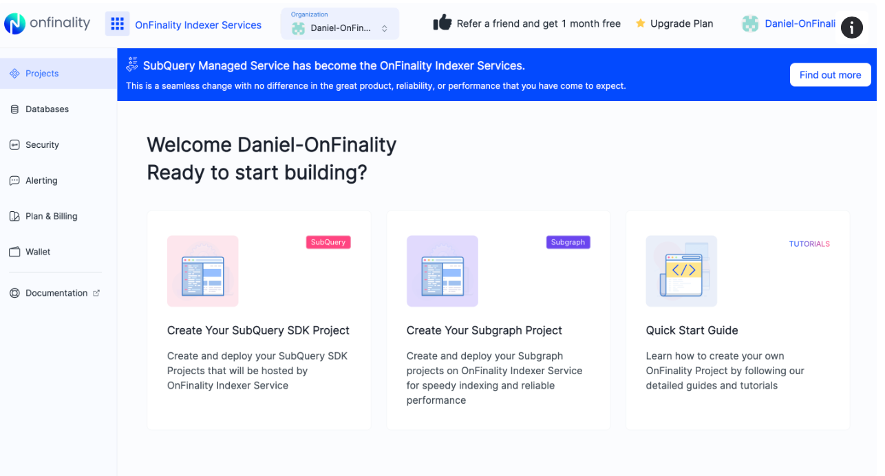 OnFinality Indexing Service is where you manage all your hosted projects uploaded to the OnFinality Indexing Service platform. You can create, delete, and even upgrade projects all from this application.