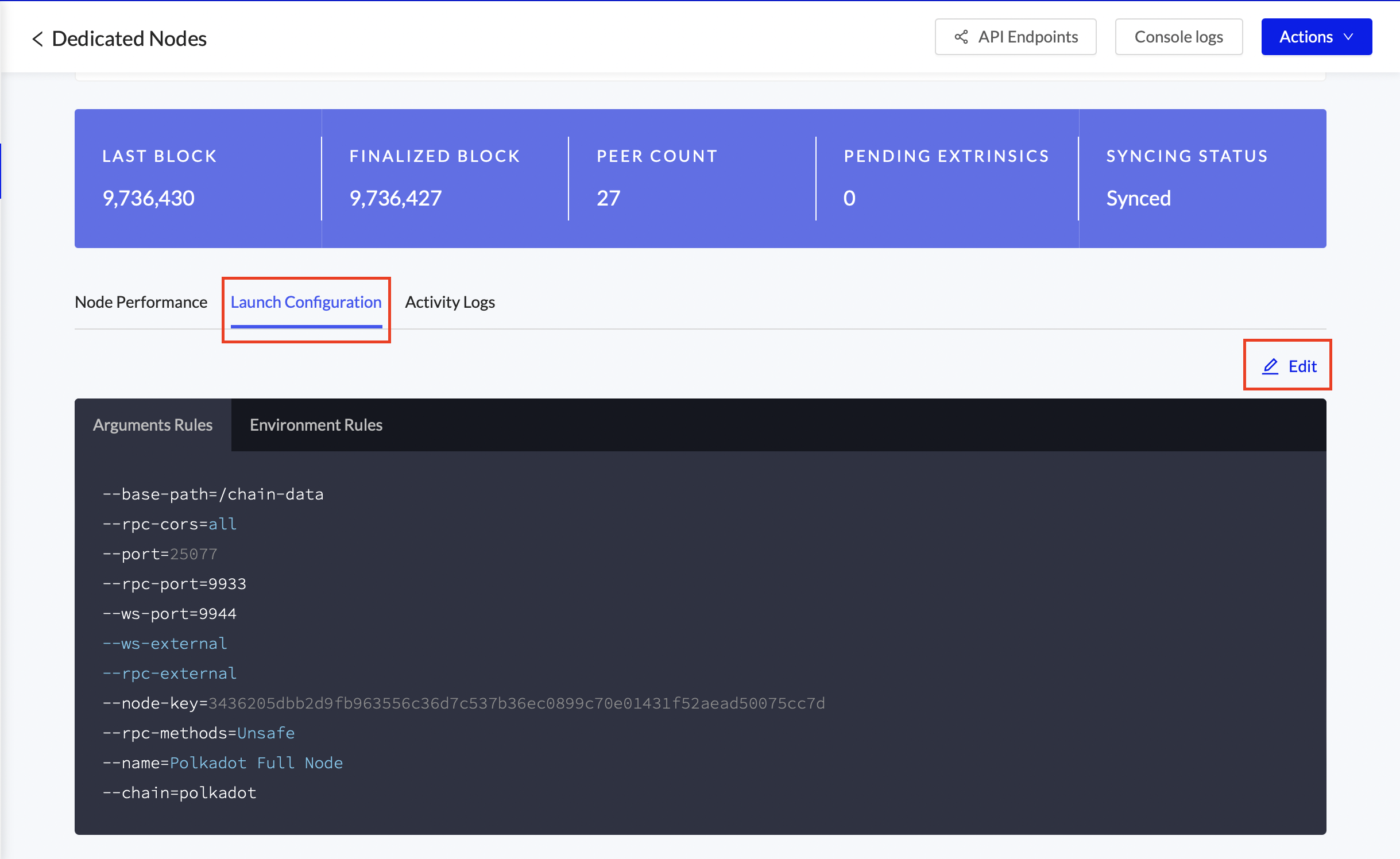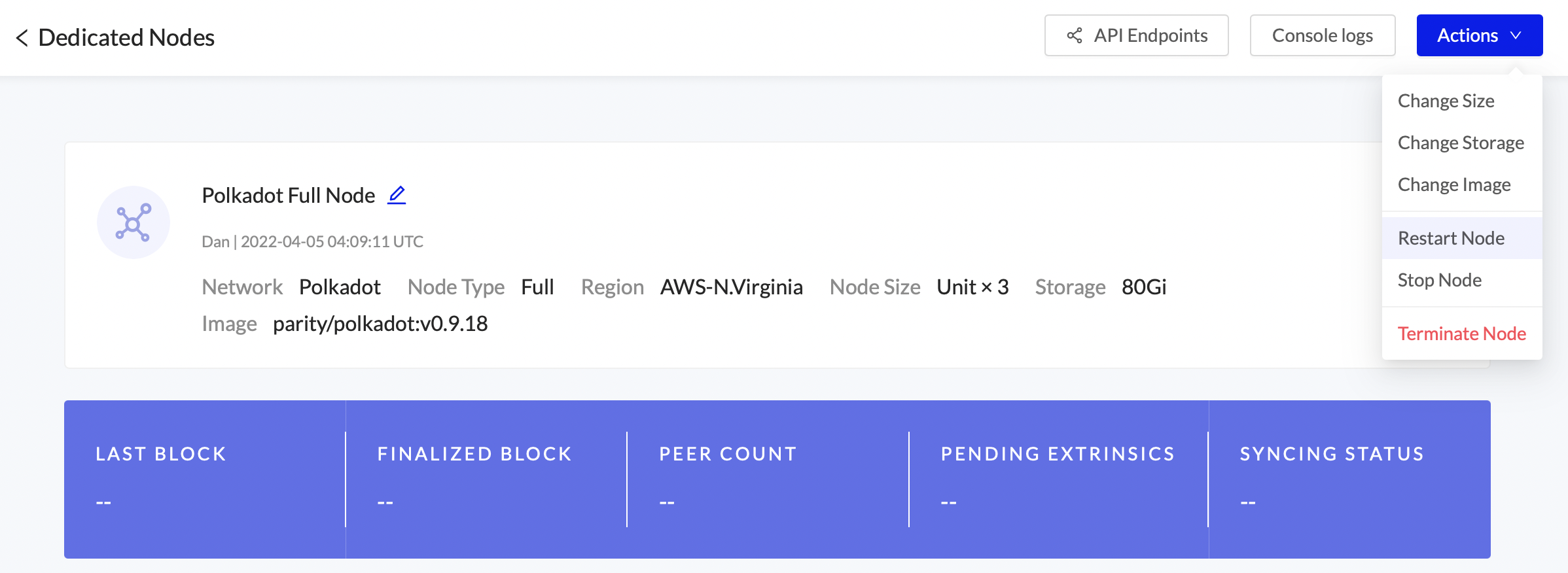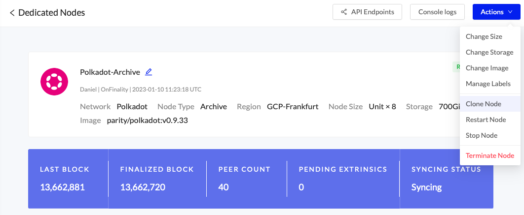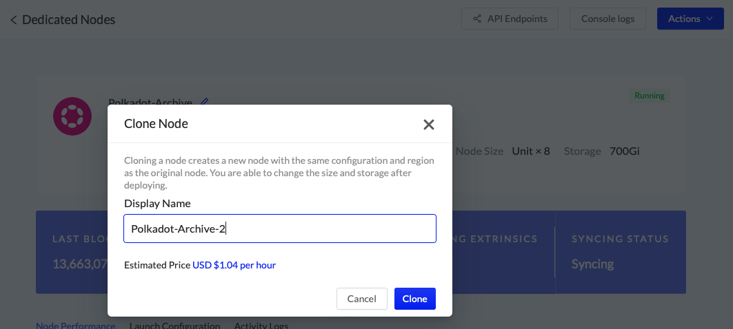 Clone an existing node to quickly expand your available resources under load or to easily add more validators and collators. When Lightning Restoreis available, the new node will be up and running within minutes with same configuration and launch arguments. You are able to change the size and storage after deploying.