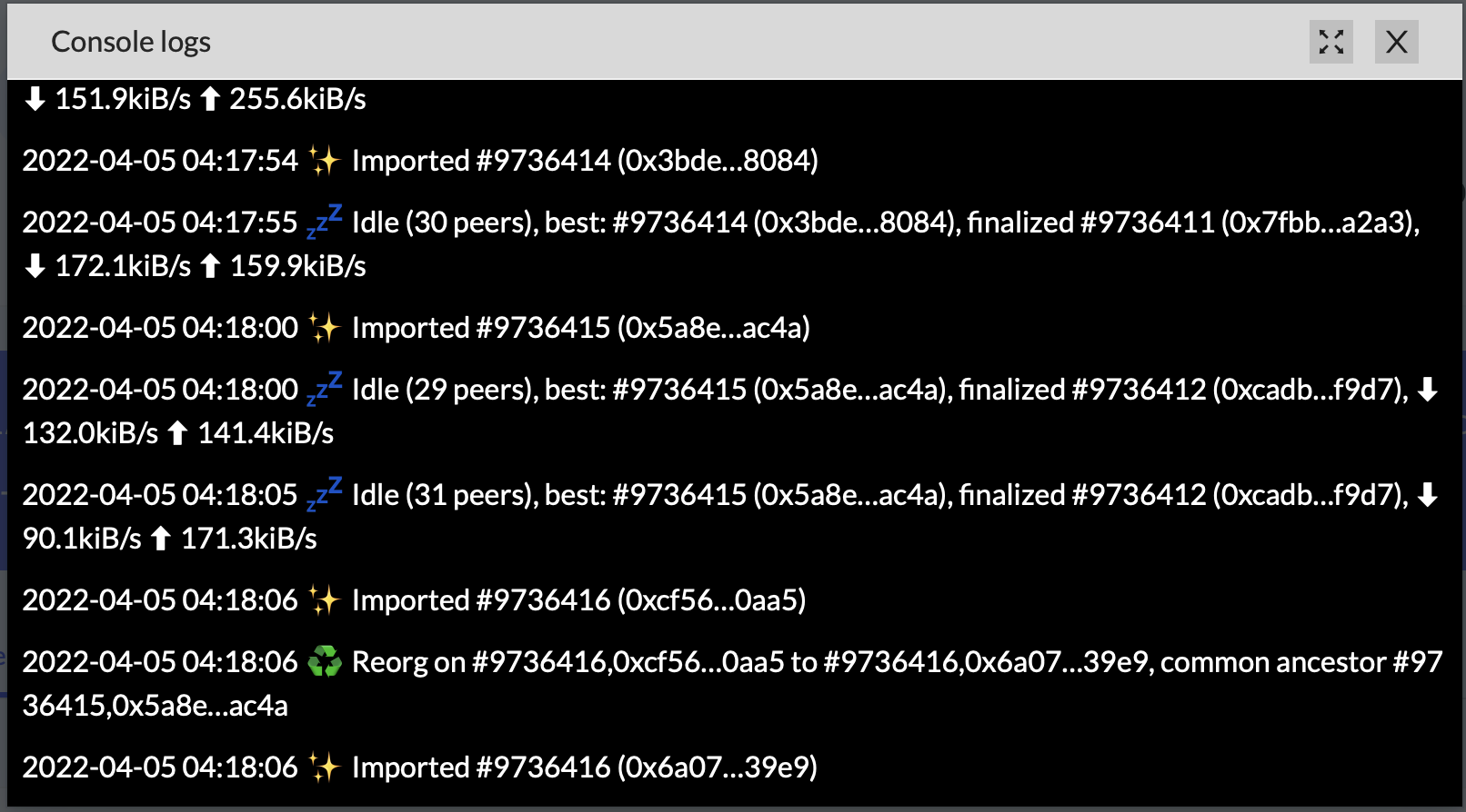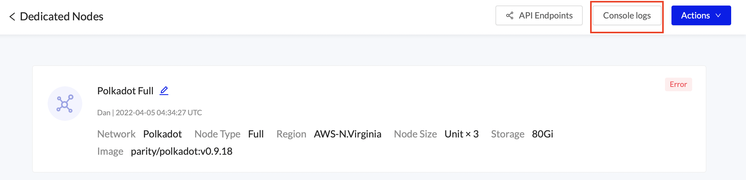 To debug issues in a node click the Console Logs button in the node details. The rolling most recent 100 logs are shown