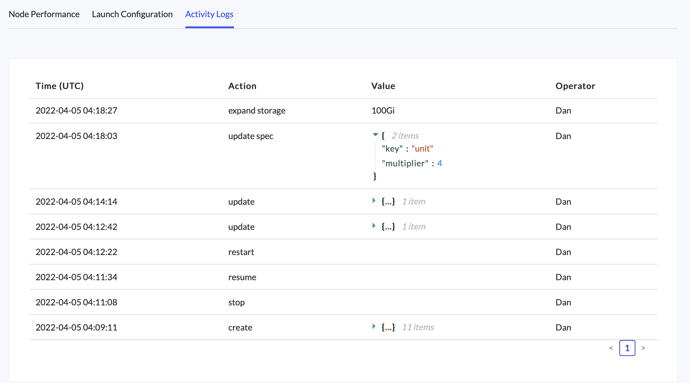 View the node’s action history under Activity Logs. Values can be expanded to view details and copied