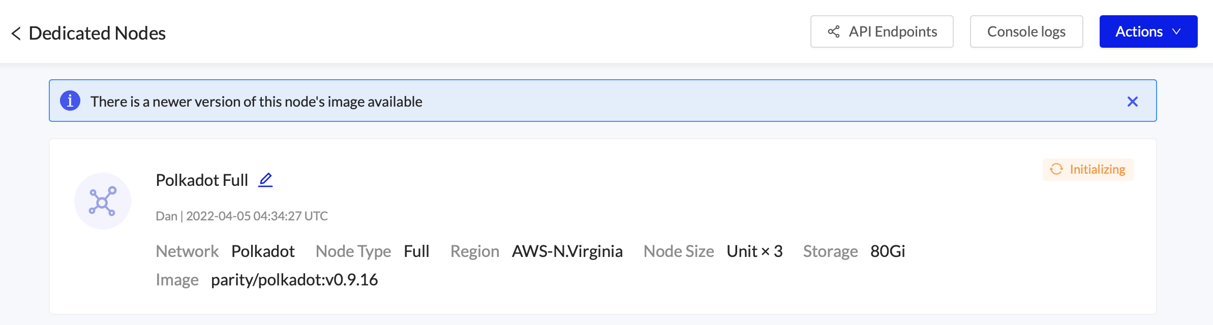 We always recommend running the network’s latest image version. If the image is out of date the following banner will be displayed in the Node Details page.
