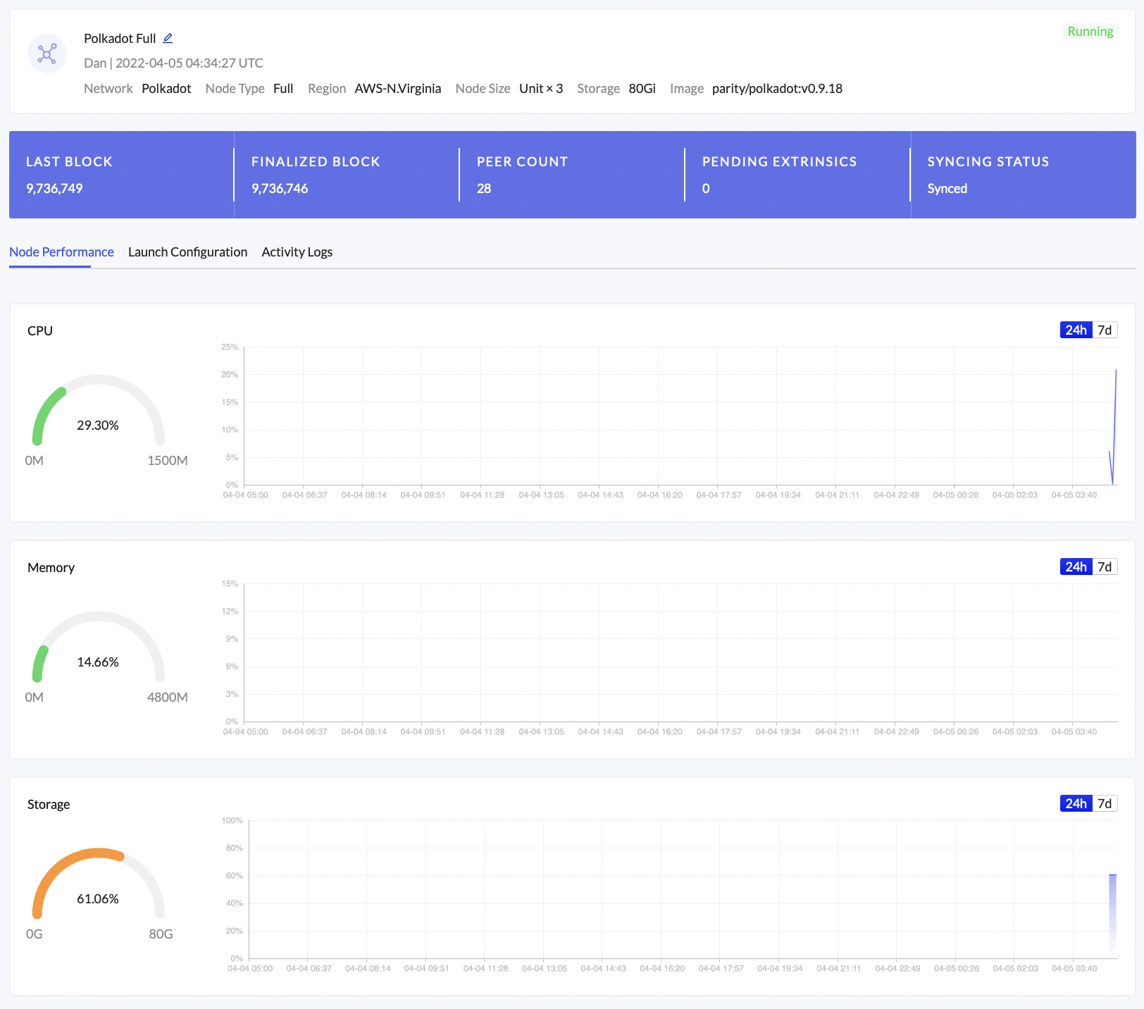 View your node’s CPU, Memory, and Storage performance.