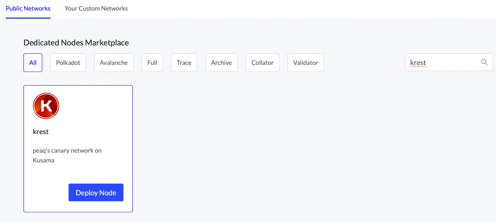 Search for krest and then click “Deploy Node”