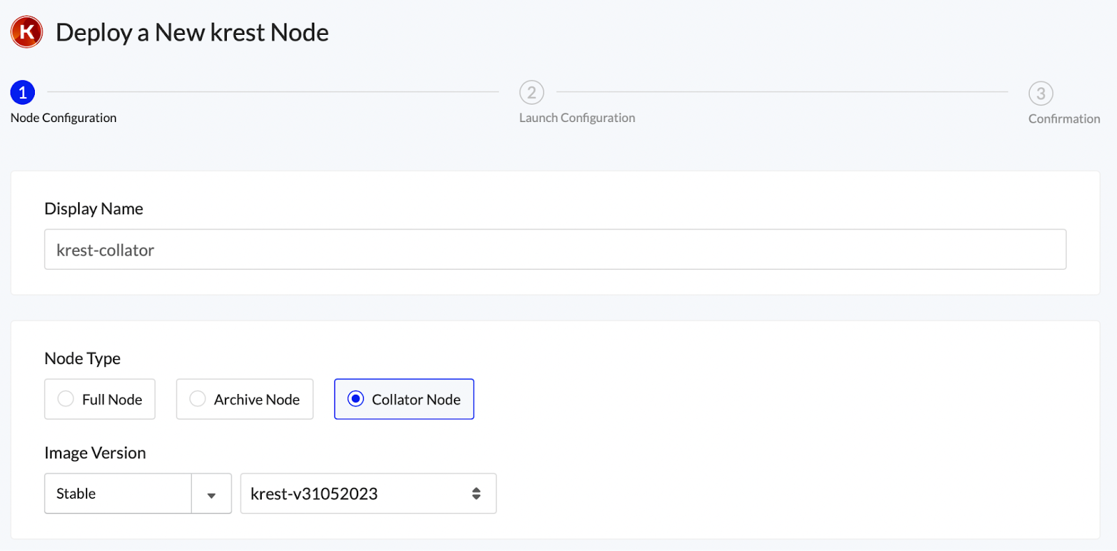 Enter an easily identifiable Display Name and select the Collator Node Type. Select the latest Image Version.