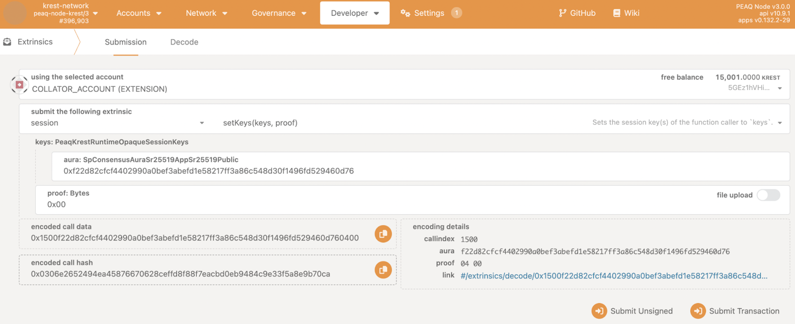 Enter the session keys using the response from author_rotateKeys in step 5 and set proof to “0x00”