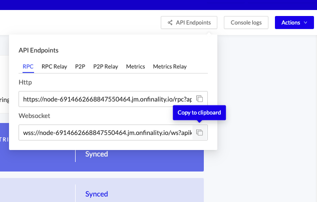 First, locate your Dedicated Node’s RPC endpoints under API Endpoints. Access is secured by an API Key at the end of the URL, so keep it safe and private.