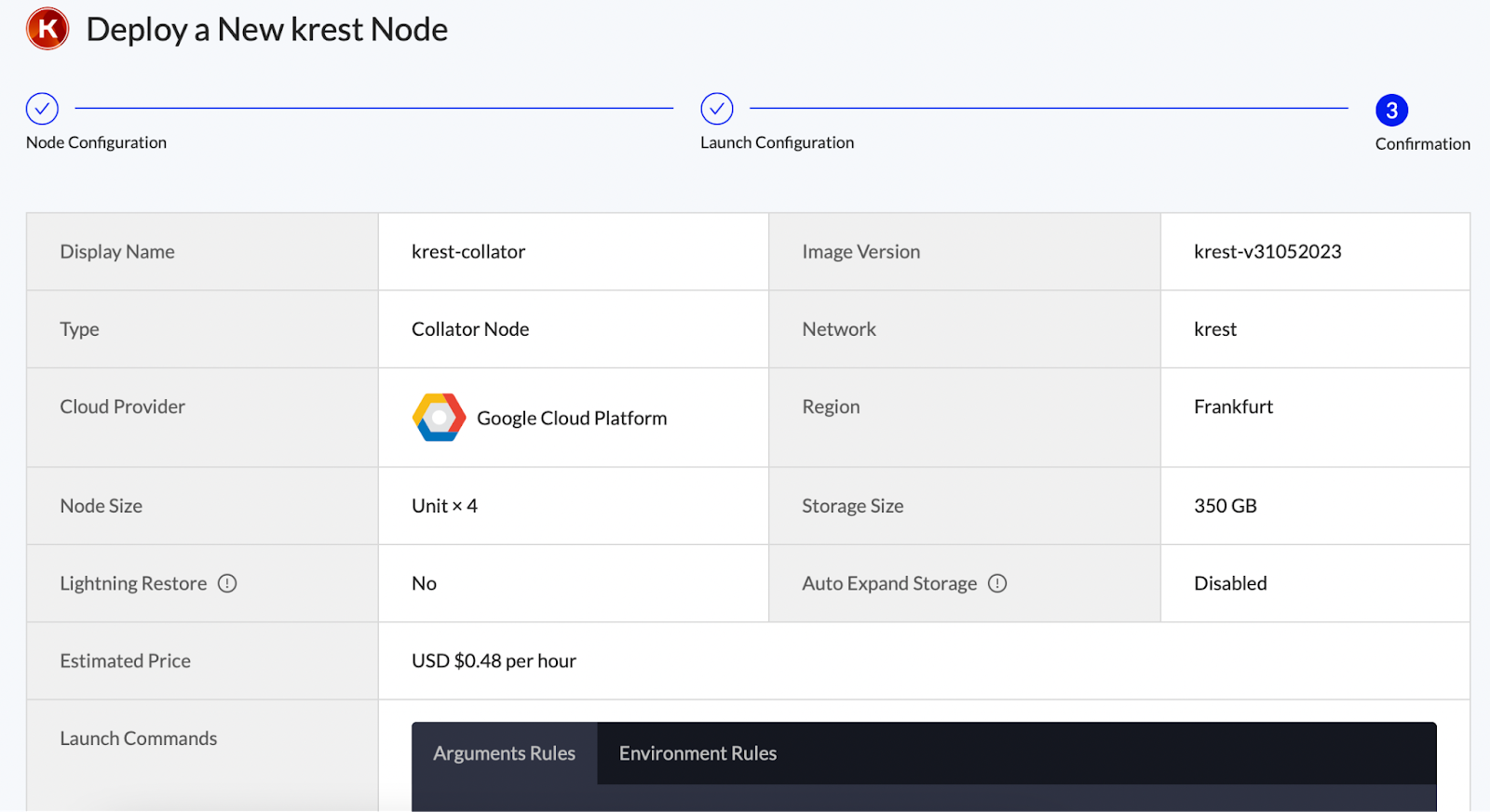 Finally, review the node’s settings and press “Deploy Node”