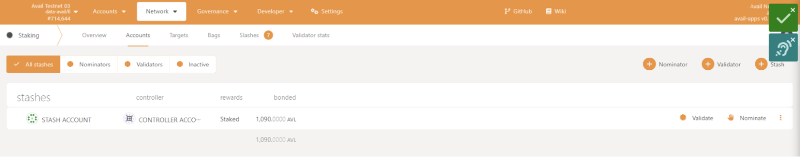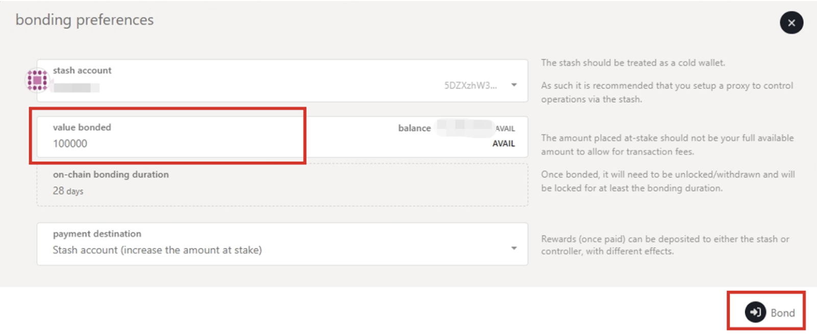 Don't bond all your AVAIL tokens as you'll need some for transaction fees. You can always bond more tokens later. Note: Withdrawing any bonded amount is subject to the duration of the unbonding period.