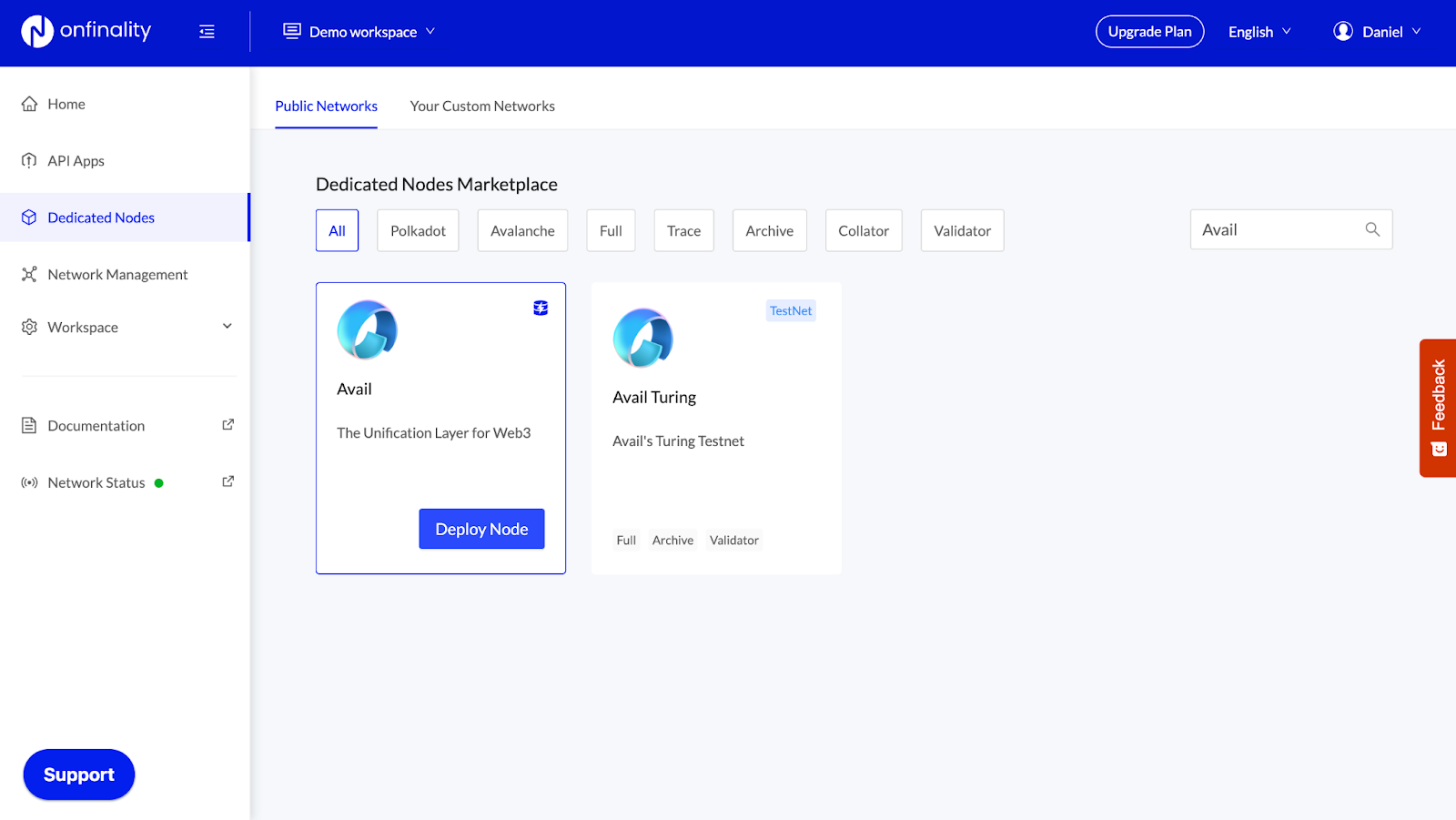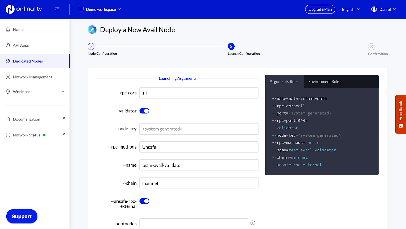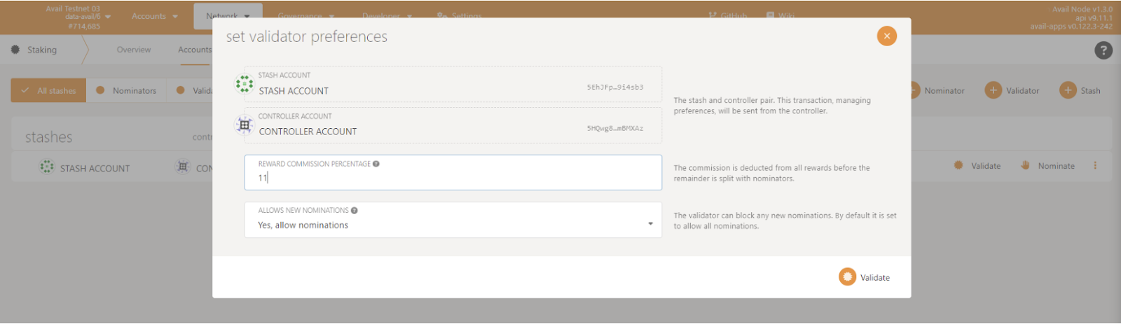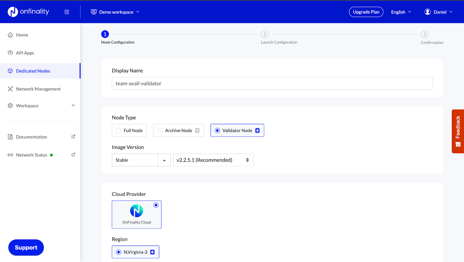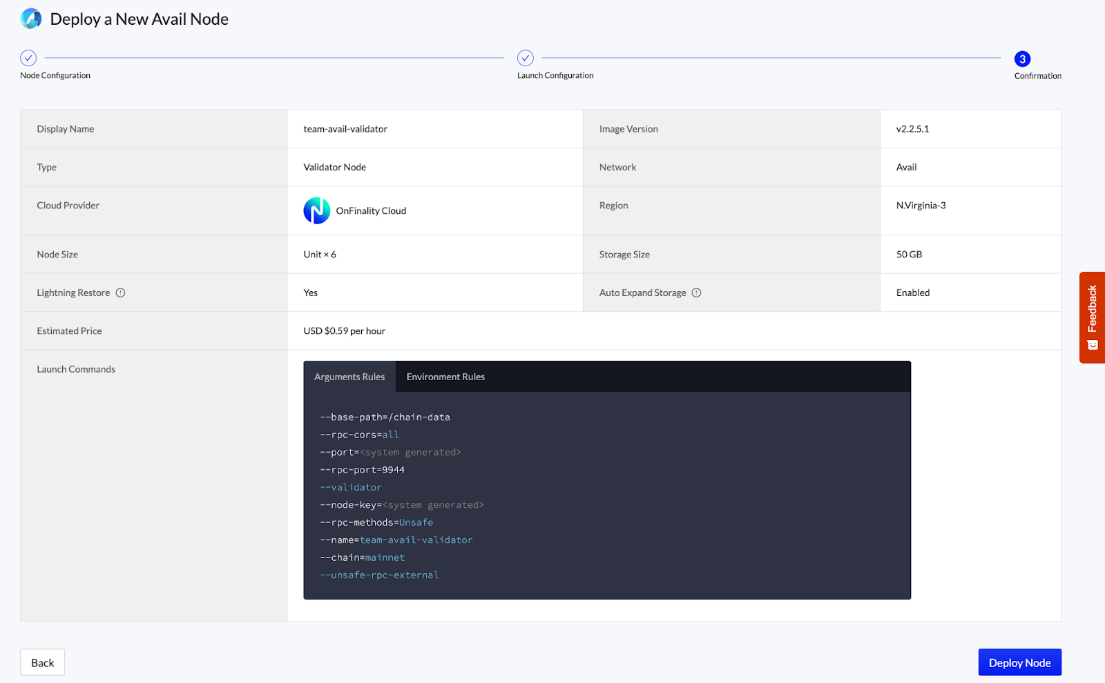 Running a Validator comes with a high risk and requires a high level of technical knowledge and skill. As per our Terms of Service, OnFinality is neither responsible for any rewards nor losses incurred when running a Validator node on OnFinality. Users should read and fully understand the relevant documentation for the Network (Avail) before setting up the node, and get in touch directly with the Network if they have any questions or concerns.