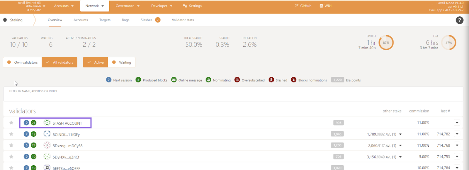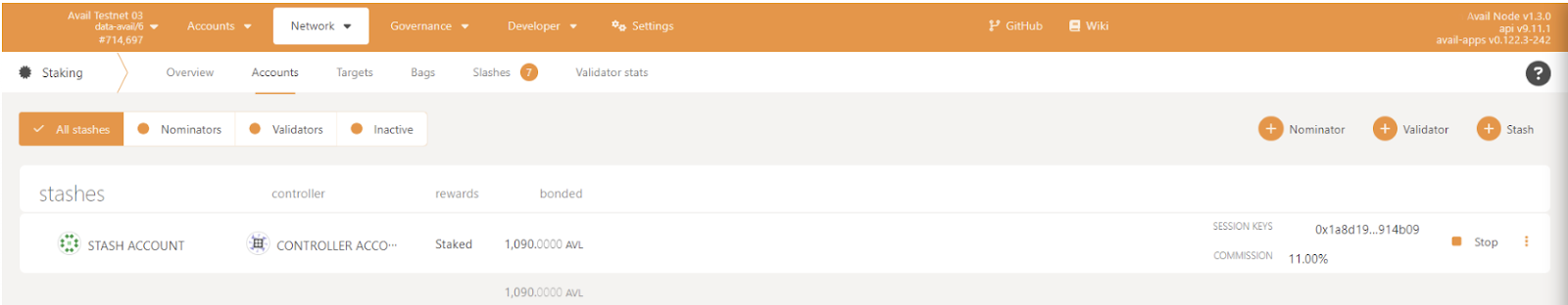 Your validator is now prepared to begin the validation process. If you wish to discontinue, you can click the stop icon. Please note that the Avail interface doesn't automatically verify if your node is synchronized; you'll need to confirm this manually.