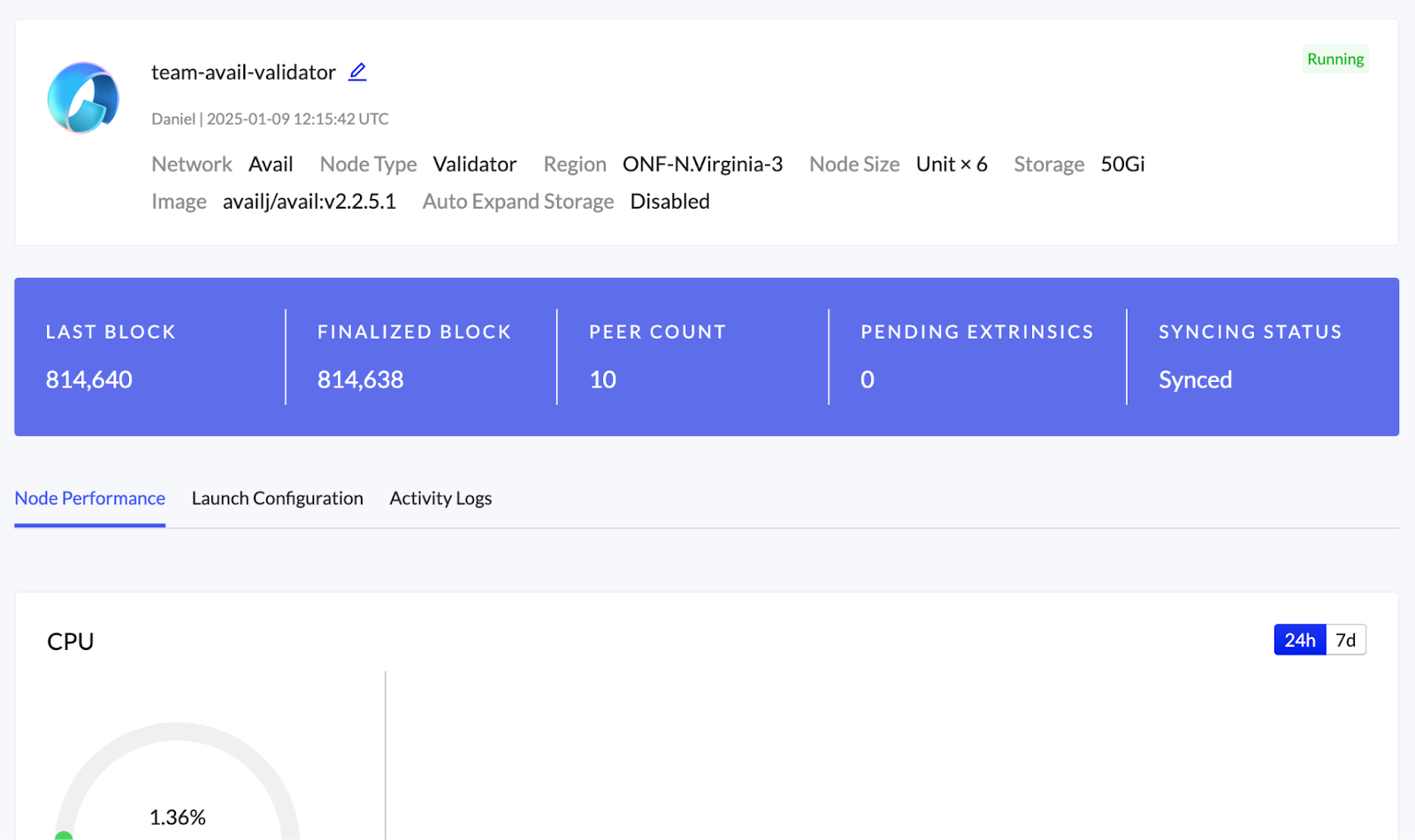 Once your node is successfully deployed, you can find it in the “Dedicated Nodes” section on our portal. Click on your node and confirm the following: