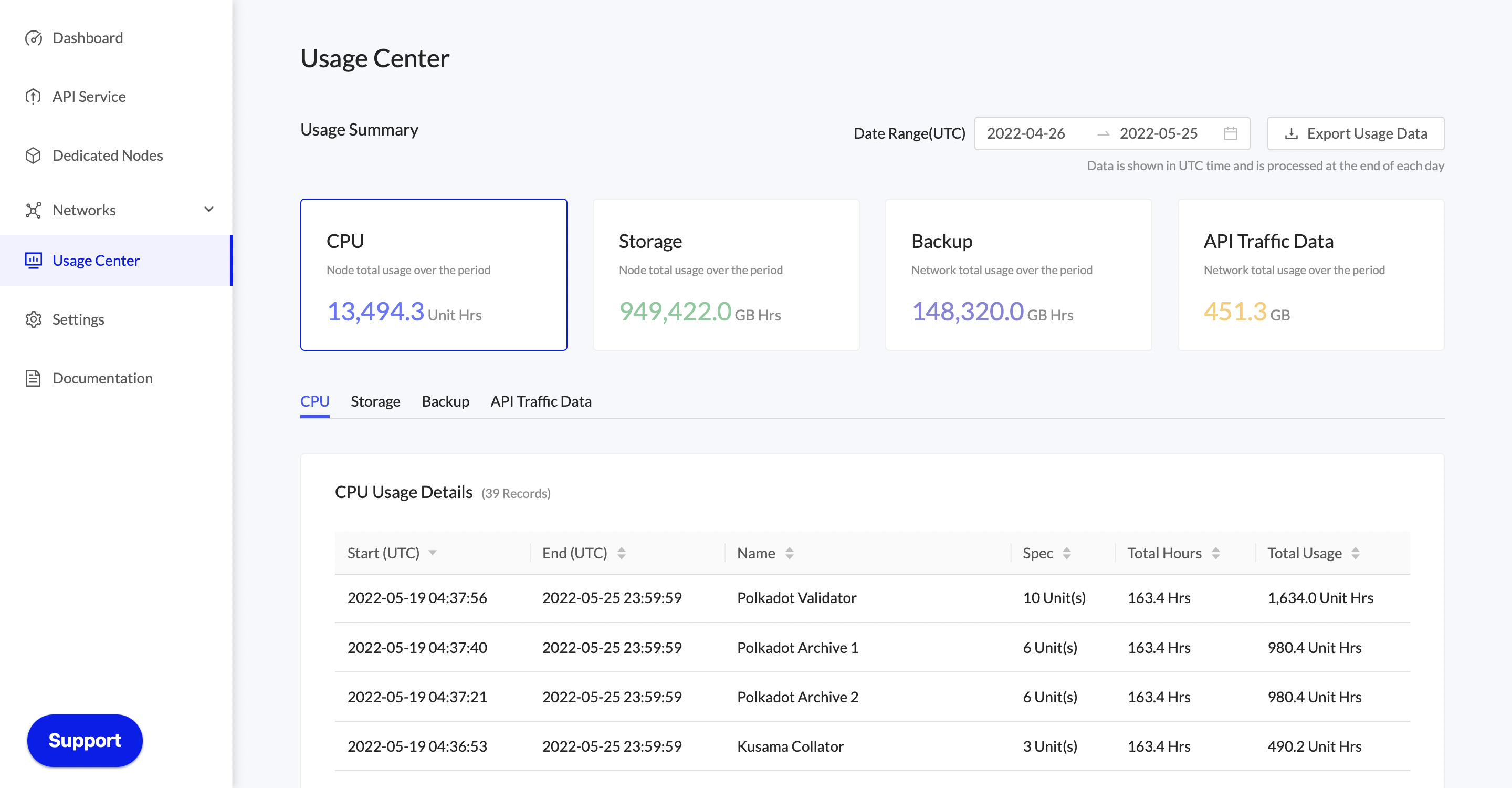 Export Usage Data for the selected type/s over the date range set in the dashboard.